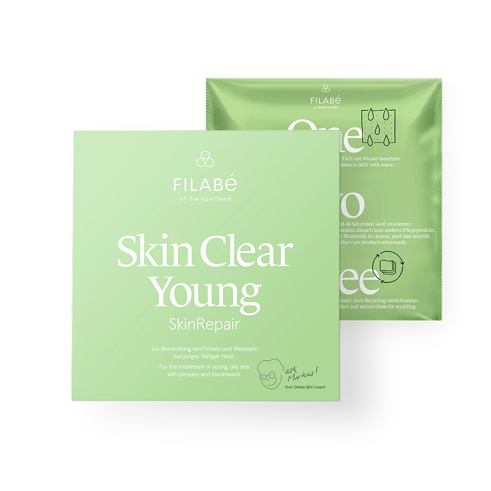 Skin Clear Young perfectly combines these factors. The cloth gently exfoliates and removes dirt, make-up and excess skin’s dead cells. The pores are opened and the skin can optimally absorb the specific active ingredients.